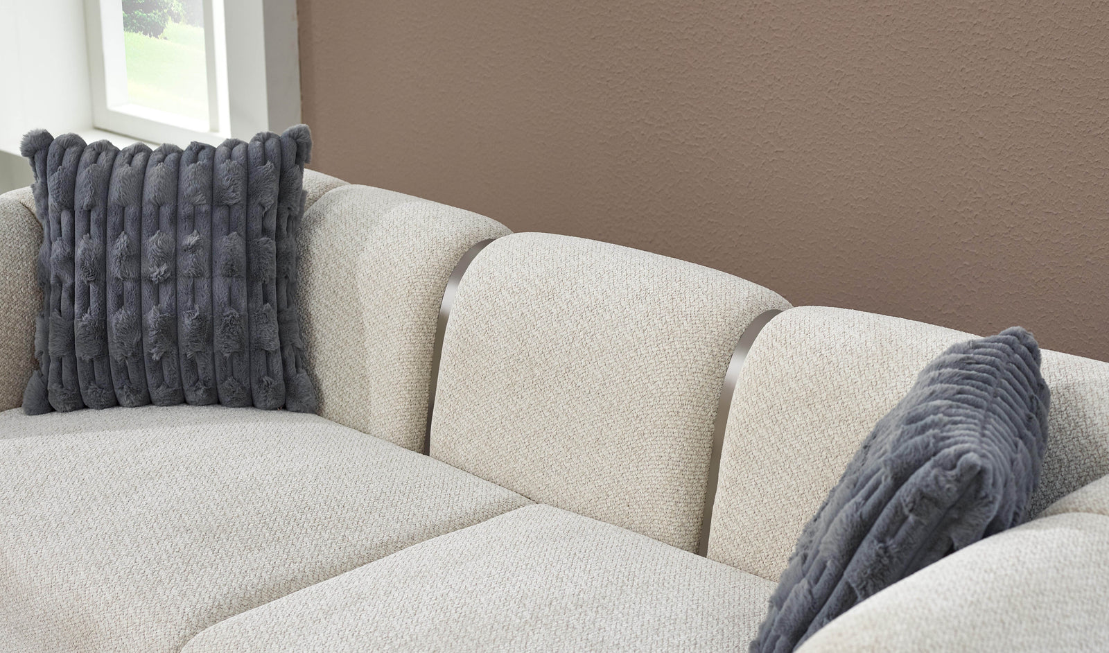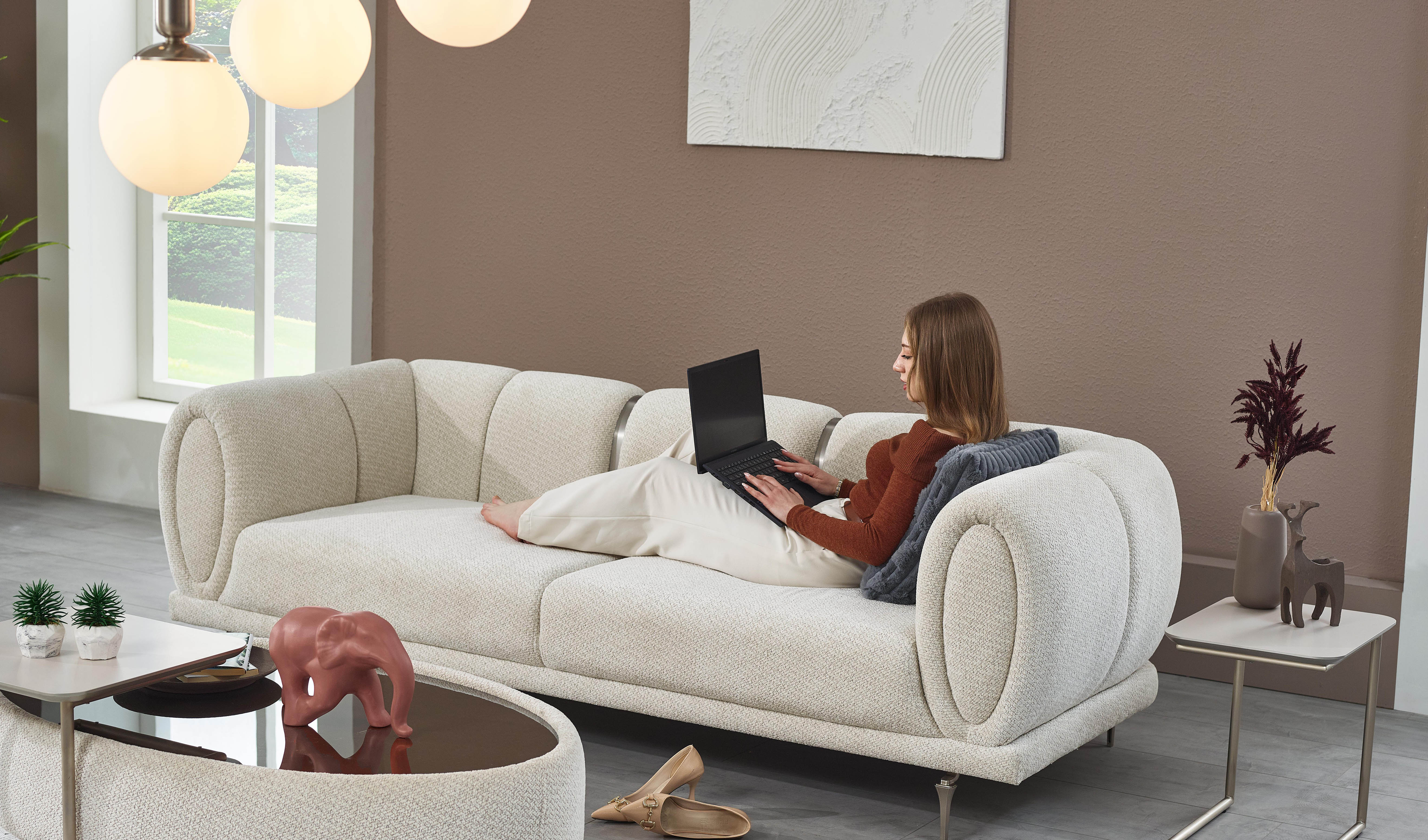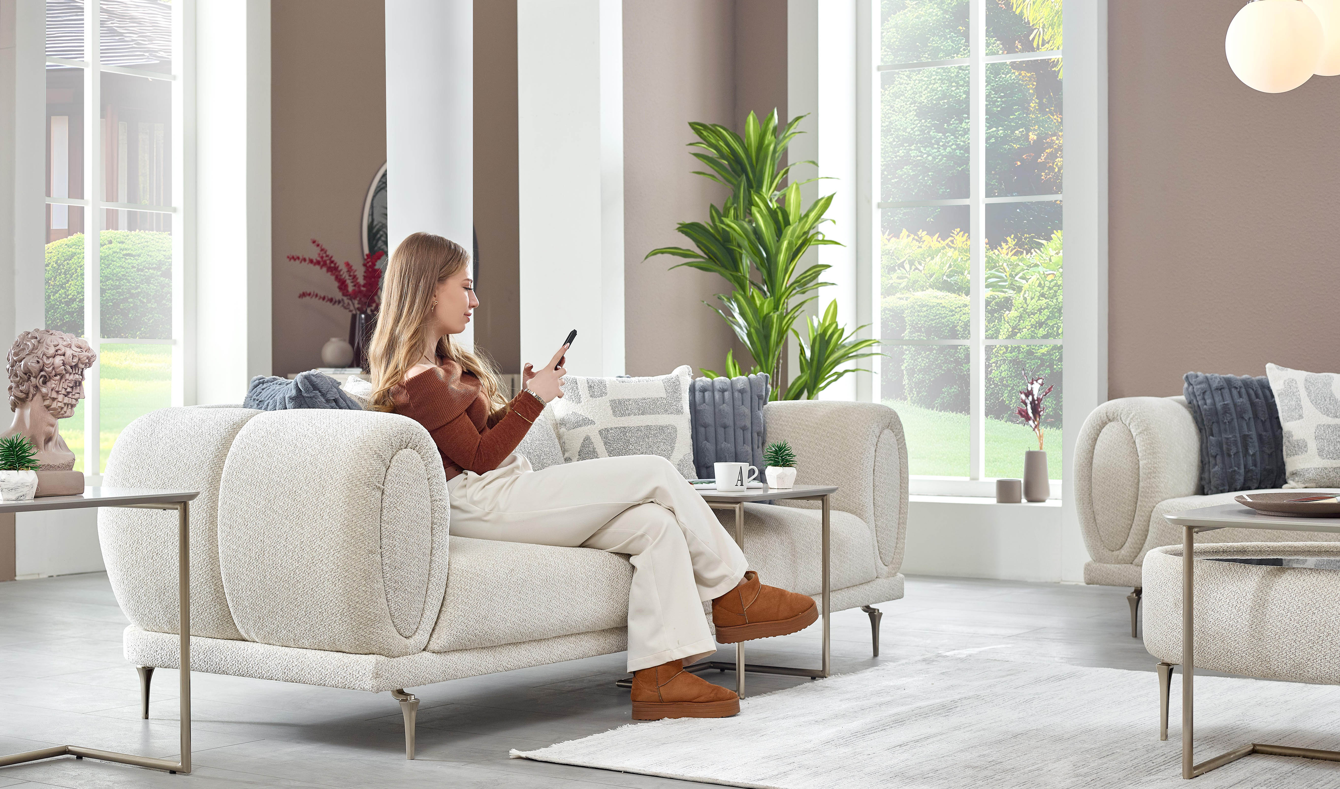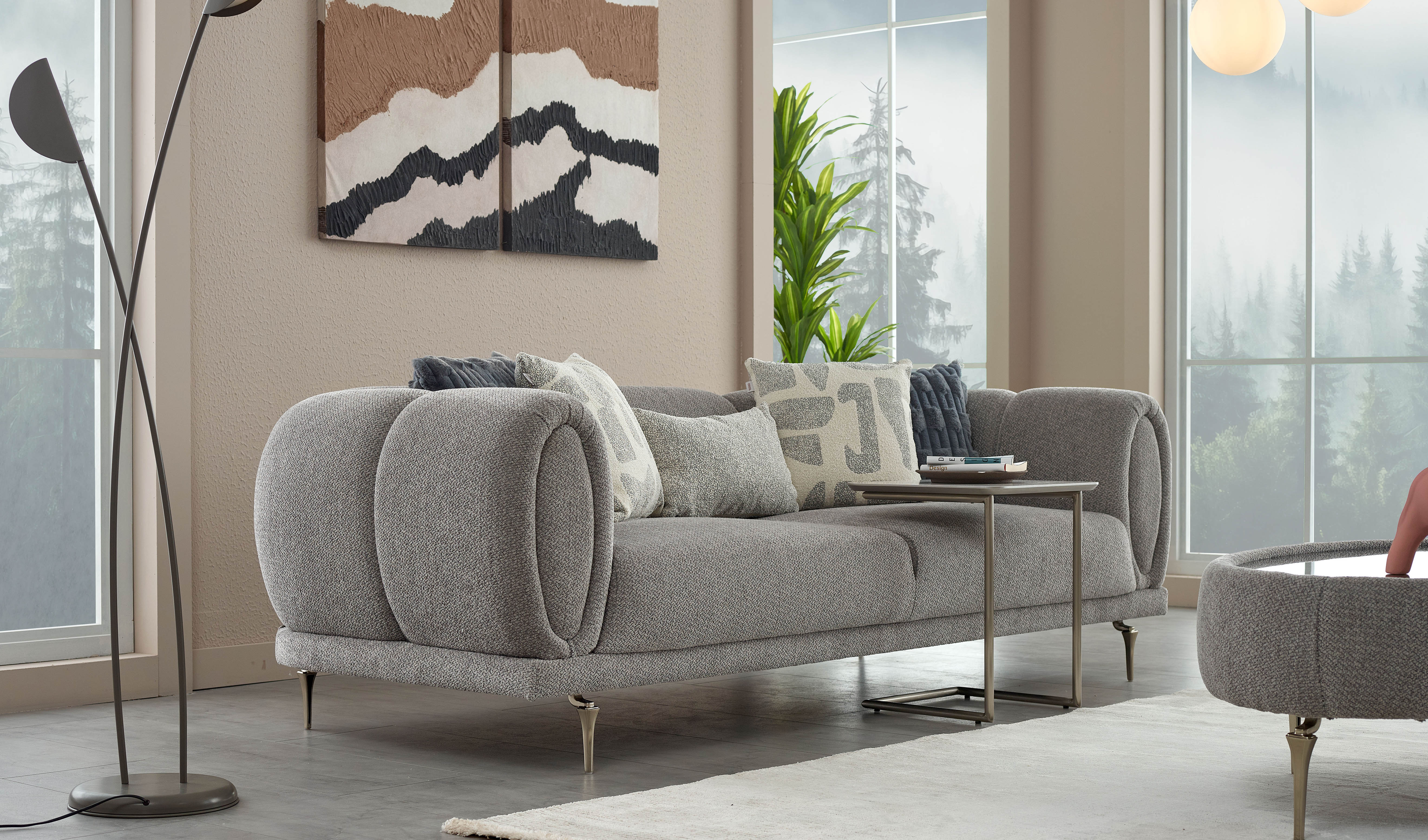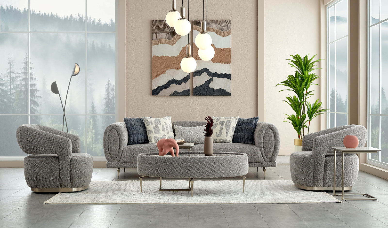 Das Novera Sofa-Set verleiht Ihren Wohnräumen mit seinem modernen Design und seiner komfortablen Struktur eine anspruchsvolle Note. Mit seinem pflegeleichten Chenille-Webstoff, der mehrschichtigen Schaumstoffpolsterung und der S-Feder-Technologie bietet es einen erstklassigen Sitzkomfort. Die metallisch glänzenden Zierstreifen und das Design der hohen Metallfüße sorgen für ein elegantes Erscheinungsbild, während der um 360 Grad drehbare Sessel absolute Bewegungsfreiheit bietet. Mit dekorativem Plüsch und gemusterten Kissenoptionen vereint Novera Ästhetik und Funktionalität in Perfektion.
