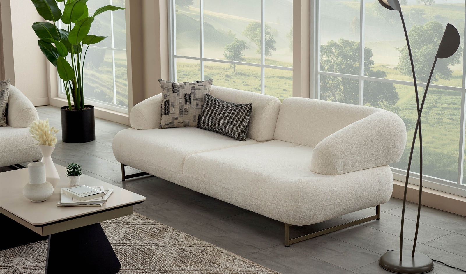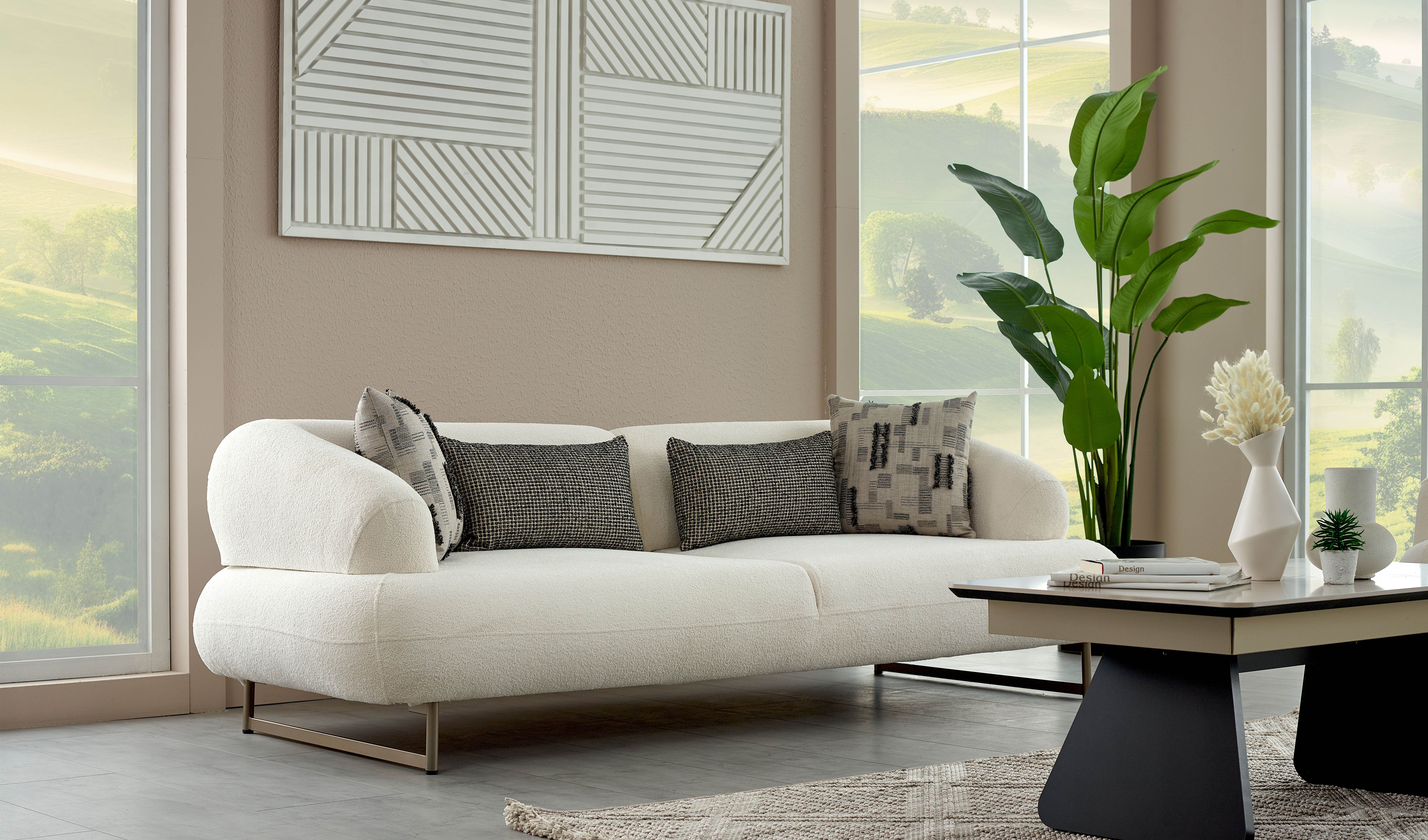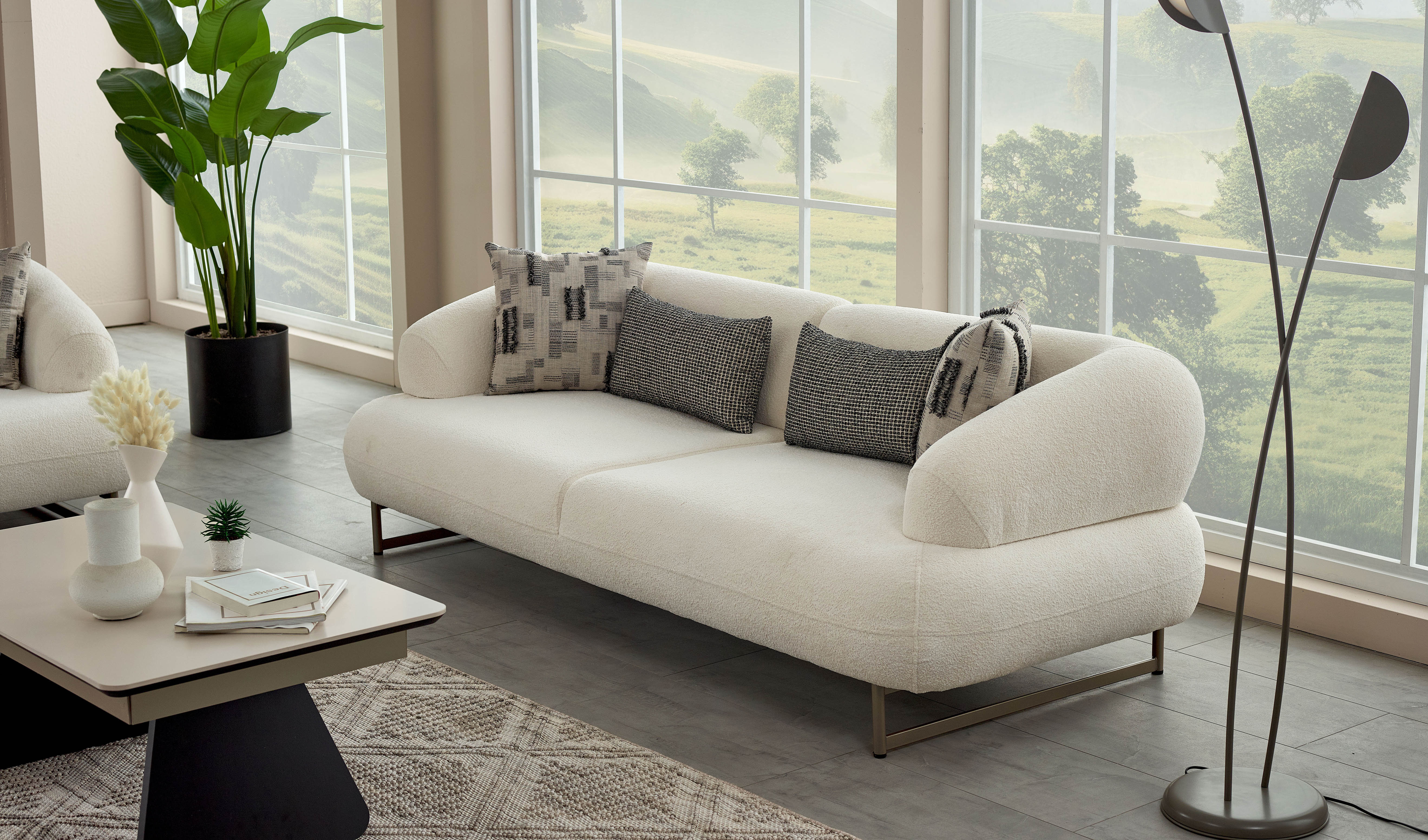 Dieses Modell besticht durch seine modernen Designlinien. Der Chenille-Stoff sorgt für eine besonders weiche Haptik, während die Kombination aus gemusterten und einfarbigen Zierkissen für ein ästhetisches Gleichgewicht sorgt.