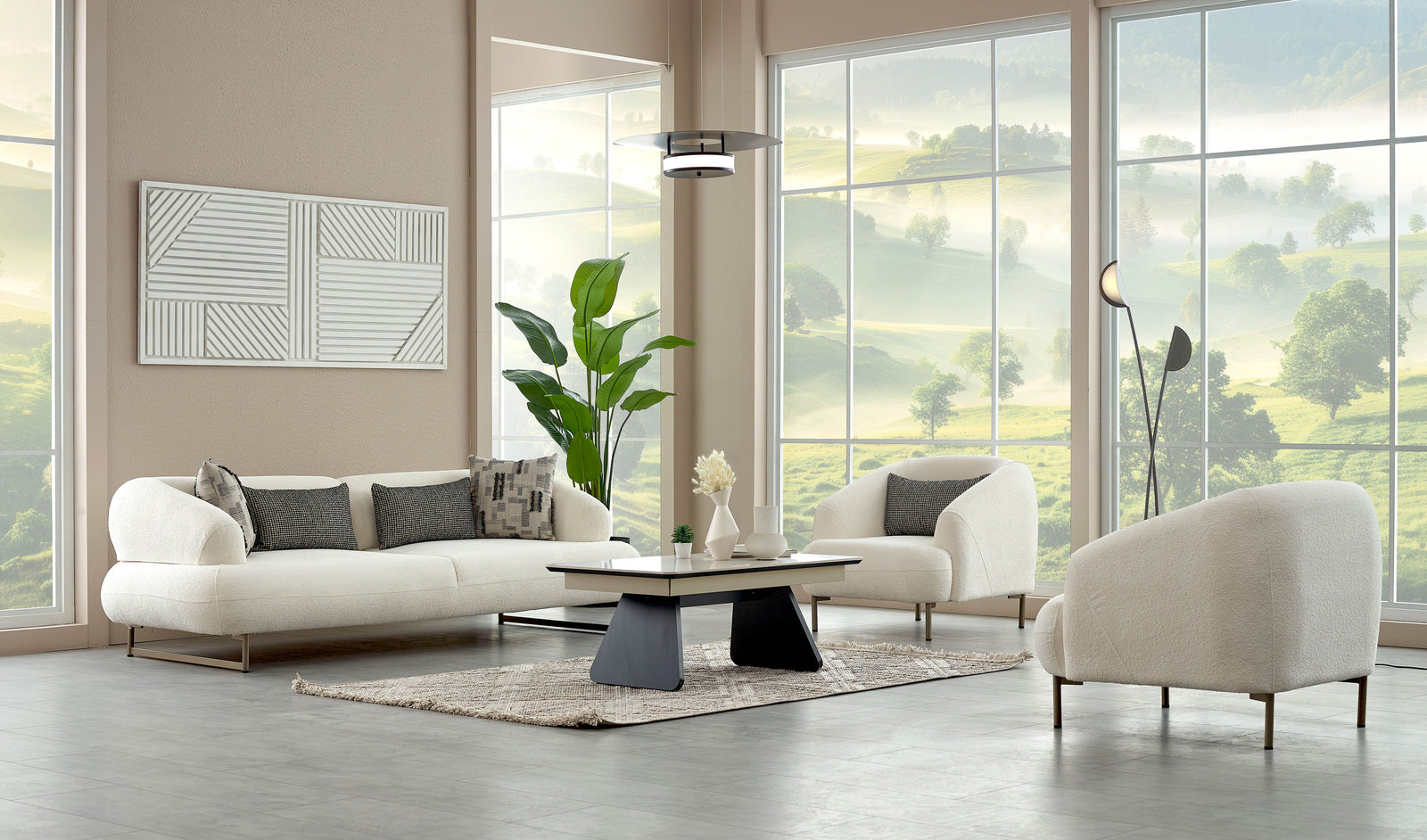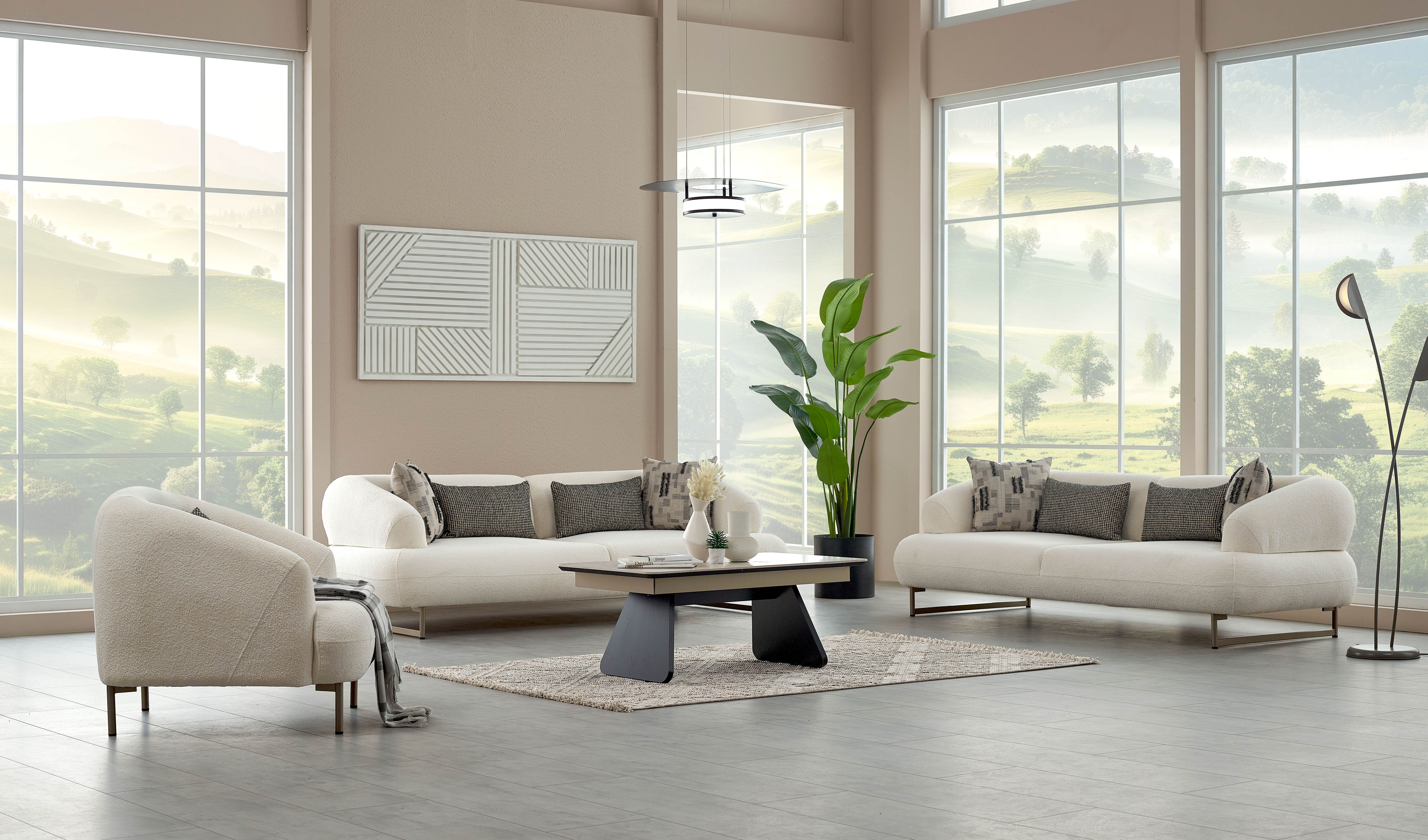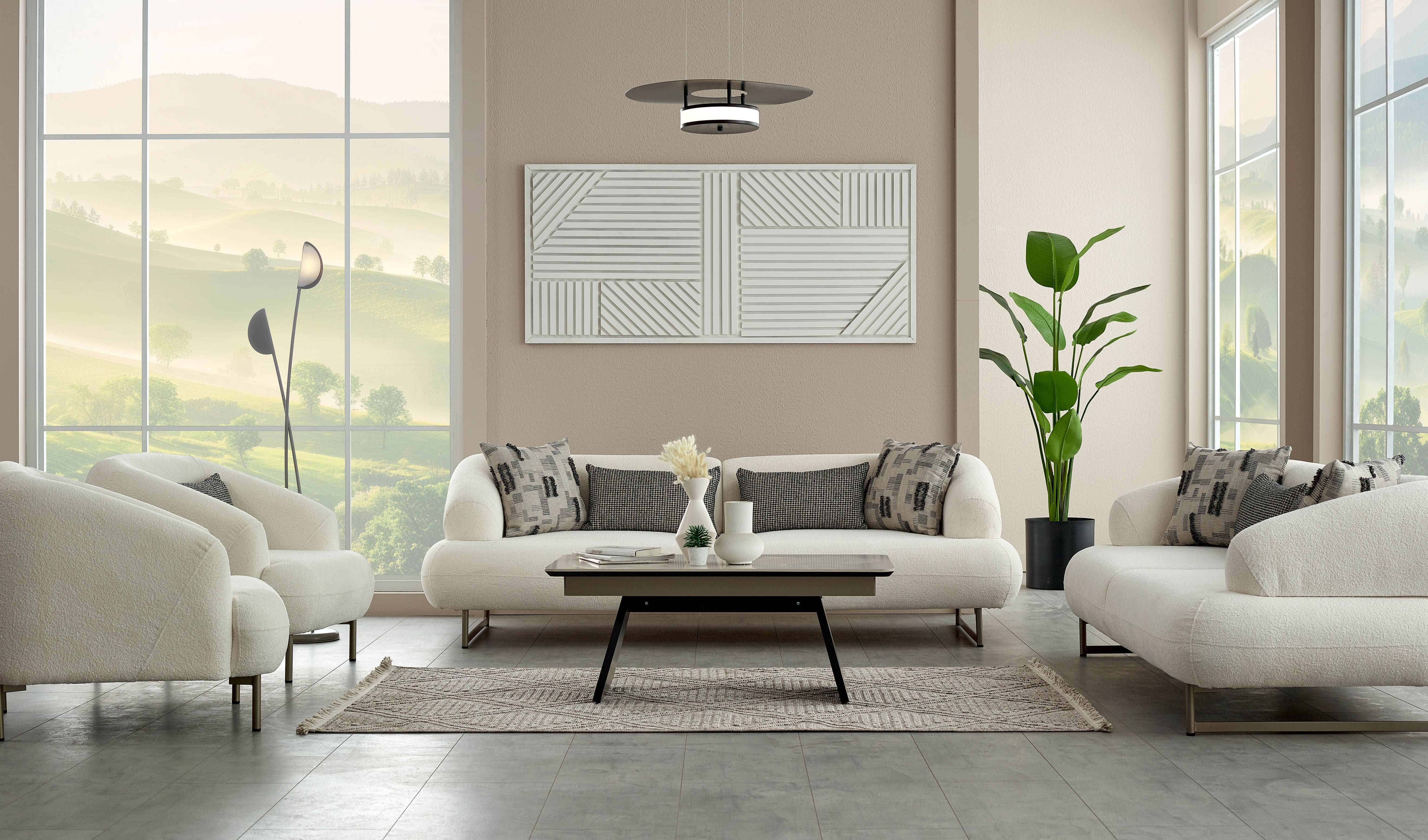 Dieses Modell besticht durch seine modernen Designlinien. Der Chenille-Stoff sorgt für eine besonders weiche Haptik, während die Kombination aus gemusterten und einfarbigen Zierkissen für ein ästhetisches Gleichgewicht sorgt.